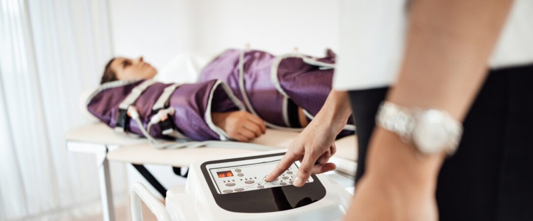 Pressotherapy is an equipment-based pneumatic compression session (also known as intermittent pneumatic compression). It uses a special multi-chamber suit that inflates and deflates to support fluid movement in the legs and improve circulation dynamics – similar to how your “muscle pump” works during walking.